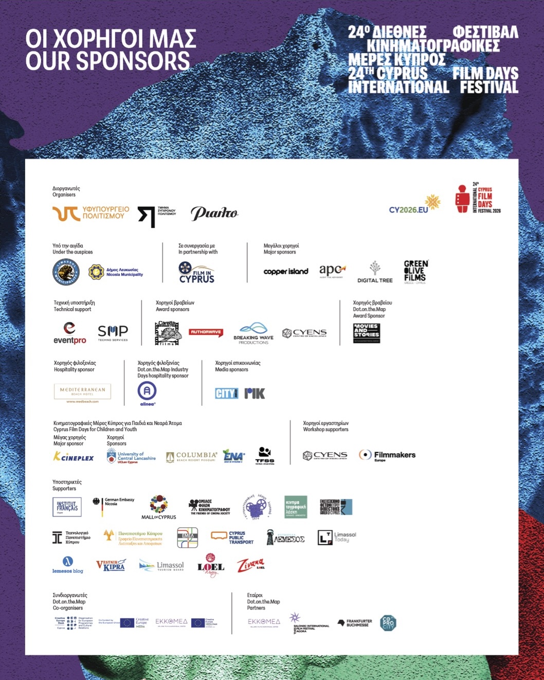 Sponsors: Columbia Beach Resort, ENA Juices, UCLan, Frederick University, The Film & Stage Studio, CIPA, APC Audit Tax Advisory, Copper Island, Digital Tree, Green Olive Films