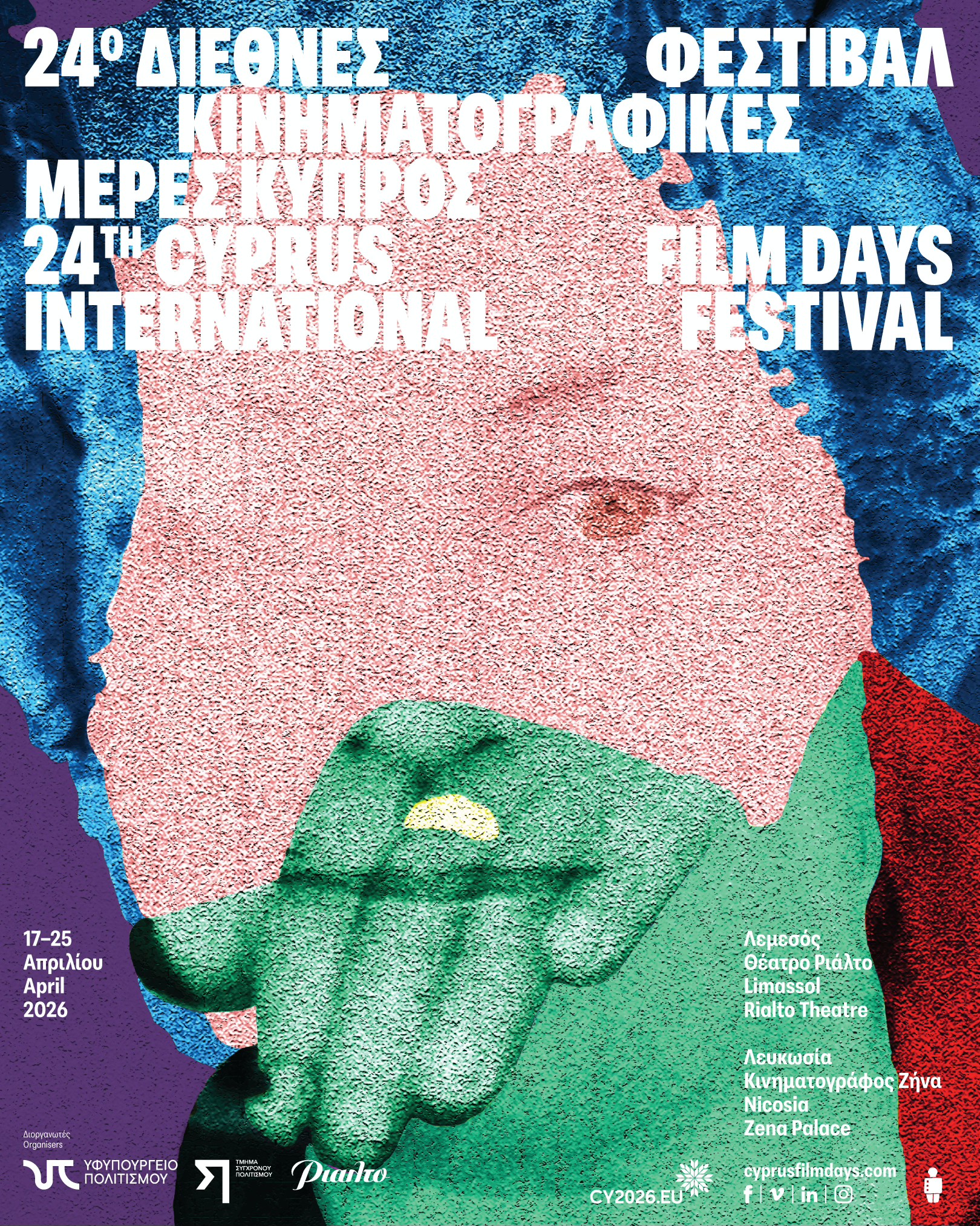 The official poster of Cyprus Film Days 2026, designed by Filippos Vasileiadis, draws inspiration from the work of visual artist Sergis Hatzidamos. It affirms that the creative process can breathe life into what time has worn away, and that presence can endure through fragments and gazes.